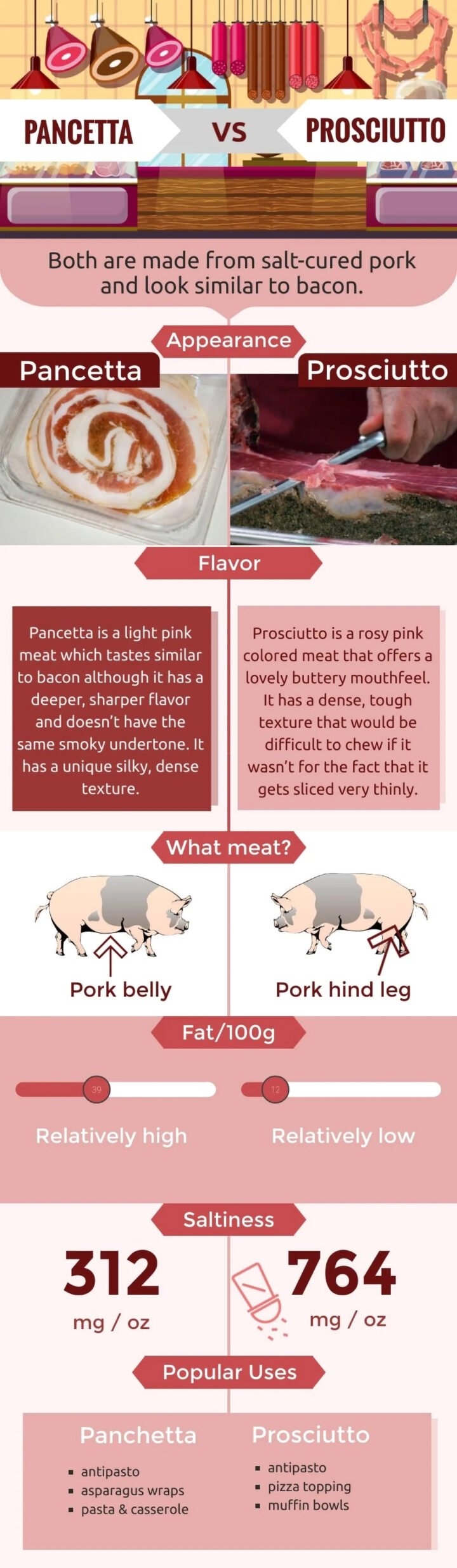 learn how prosciutto and pancetta are made from different cuts of pork, cured for different lengths of time, and have distinct tastes and textures. Find out how to enjoy them raw or cooked in various dishes and recipes. learn how to tell apart pancetta and prosciutto by their appearance, taste, and cut. Find out which one is healthier and how to use them in various dishes. Find out how to use them in. learn the differences between pancetta and prosciutto, two types of italian cured meats. Discover their origins, curing processes, physical characteristics, and culinary uses. learn how these three pork products are cured, smoked, and cooked differently. learn how prosciutto and pancetta are made from different cuts of pork and have different textures, flavors and uses. pancetta and prosciutto, while both delicious cured pork products, offer distinctly different culinary experiences.